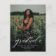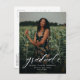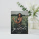 Comemore seu formando e convide os convidados com este cartão postal de anúncio vertical de graduação em uma foto que apresenta um formando moderno e moderno de um roteiro de caligrafia na frente e um retorno personalizável para os detalhes do seu partido.