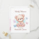 Celebrar a mãe a ser com um urso fofo e um cartão postal de chá de fraldas de borboletas. A frente tem o nome do evento especial junto com o nome da futura mãe, assim como seu monograma. Os detalhes do evento de chá de fraldas estão na parte traseira do cartão-postal do convite. Há também um código QR que pode ser usado para respostas de RSVP (ou até mesmo um registro de chá de fraldas se apenas um endereço da Web for necessário). No verso, há espaço para seu endereço de devolução, bem como o endereço de correspondência do destinatário, para que sejam impressos diretamente no cartão postal. O dorso também tem cor rosa como cor focal. Design de Urso e Borboletas. Use a modelo para personalizar.
