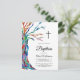 Convide a família e os amigos para o batismo do seu bebê com este cartão-postal de convite para na moda. Apresenta uma árvore genealógica nas cores do arco-íris e uma cruz. Facilmente personalizável com seus detalhes. Este design único é um impressão de um mosaico da Árvore Familiar que foi feito de pequenos pedaços de vidro de cor clara. Porque nós criamos nosso próprio trabalho de arte você não encontrará essa imagem exata de outros designers. Mosaico original © Michele Davies.
