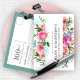 Tão bonito peônias rosa. Eles criam uma fronteira superior e inferior para o anúncio de uma centésima celebração festa de aniversário. Três linhas de texto permitem personalizar sua saudação na frente do cartão postal do convite de aniversário. Os detalhes da festa de aniversário estão atrás. As peônias têm centros cor-de-rosa escuro e pétalas externas cor-de-rosa macio. A design botânica moderna inclui as folhas profundas e os contornos da vinha azul-turquesa. Todo texto pode ser editado.