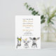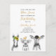 Seu bebê está virando um! Convide seus convidados especiais com este adorável cartão postal de convite que inclui animais de fazenda feitos à mão (cavalo, porco, vaca e pintinho) em preto e branco. O nome do bebê, "primeiro aniversário" e a data estão na tipografia de script com letra de trigo/amarelo, e personalizada em um sans preto moderno chic. Copyright Elegant Invites, todos os direitos reservados.