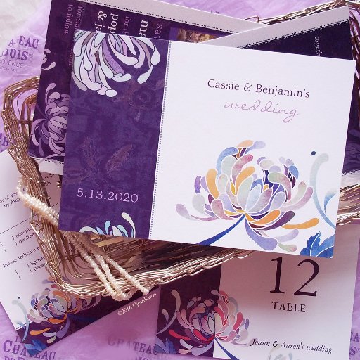 Flores coloridas e elegantes do crisântemo em cinzas e tons roxos + riscas largas de ameixa desenhadas em Cartões de Resposta de Casamento. ((Você pode encontrar os essenciais de casamento e favores nesta loja, Bridal Heaven. Entre em contato com ujean4791@gmail.com para obter trabalho personalizado e/ou coordenar papelaria de casamento.)
