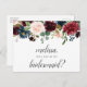 O cartão postal da proposta Bridesmaid apresenta uma peça central geométrica com flores azuis e marinho com letra manuscrita burgundy e azul-dentro.