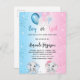 Para um chá de fraldas revelador de gênero. Um plano de fundo azul branco e rosa. Decorados com balões claros e azuis, cor-de-rosa e branco e poeira brilhante. Um elefante bebê e um elefante da gaby. Personalize e adicione o nome da mãe a ser e os detalhes da festa. O nome e o texto: Boy ou Girl são escritos com um estilo escrito à mão