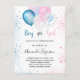 Para um chá de fraldas revelador de gênero. Um fundo branco chic. Decorados com balões claros e azuis, cor-de-rosa e branco e poeira brilhante. Personalize e adicione o nome da mãe a ser e os detalhes da festa. O nome e o texto: Menino ou Menina são escritos com um script estilo escrito manualmente Back: poeira azul e rosa brilhante, design postal. Dica: Se você não quiser que pareça um cartão postal, clique em personalizar, vá para o verso e remova o divisor e o carimbo de posto.