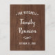 Este convite para a reunião da família simples e na moda ou para salvar a data do cartão-postal apresenta uma escrita branca moderna e uma tipografia sans serif numa madeira rusticada e castanha. Há um lugar para você adicionar seu nome de família e a data, e você pode até mudar o nome para algo além de "reagrupamento familiar", se quiser! A parte de trás do postal tem bastante espaço para todas as informações necessárias. Este cartão-postal é uma forma excelente de orgulhar-se de anunciar o seu evento ou reunião familiar.