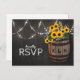 Cartões postais do rsvp de casamento de na moda country com pano de fundo preto rústico, luzes de enrolar, girassóis amarelos de verão, um barril de madeira de adega com suas iniciais e um pedaço de corda entupida.