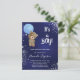 Para um chá de fraldas celebrando um menino. Um fundo azul marinho, a cor azul é irregular. Decorado com pó falso de cinza prateada. Um ursinho de pelúcia segurando um balão azul claro. Personalize e adicione o nome da mãe a ser e os detalhes da festa. O nome e o texto: É um Rapaz! são escritos com um estilo escrito à mão. Traseiro: design postal. Dica: Se você não quiser que pareça um cartão postal, clique em personalizar, vá para o verso e remova o divisor e o carimbo de posto.