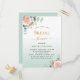Fundo verde e gradiente branco. Decorados com ouro-rosa e flores cor-de-rosa, flores rosa e folhas de eucalipto, borras, verde e borras de ouro. Personalize e adicione o nome da noiva a ser e os detalhes da festa. Letras pretas e ouros coloridas. Verso: cor verde do fundo.