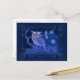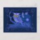 Arte Original de Coruja Azul em galho de árvores com montanhas, céu noturno, nuvens e lua com borda decorativa, também original, em cartão-postal.