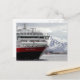 O navio de cruzeiro Hurtigruten chegando ao porto no final da Primavera, ao fundo as montanhas que rodeiam Tromsø ainda estão cobertas de neve branca.