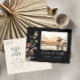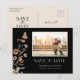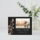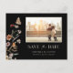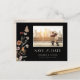 Cartão postal de data de reserva de foto floral preto. Este cartão postal de anúncio de data de reserva de foto elegante e sofisticado apresenta belas flores silvestres pintadas à mão em aquarela dispostas em um lindo buquê perfeito. Encontre itens correspondentes na Coleção de Casamento Boho Selvagem Preto.