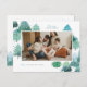 Um cartão postal de férias com uma foto apresenta ilustrações de aquarela de pinheiros de inverno.