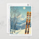 Olá das montanhas nevadas de Hunter Mountain, Nova York, EUA! Esperamos que você esteja tendo uma maravilhosa férias de esqui. Este cartão postal apresenta uma paisagem montanhosa azul-cinza deslumbrante com pranchas de esqui retrô em um padrão tribal laranja.