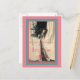 Foto curiosa de uma mulher segurando uma pequena árvore de Natal, nua de ornamentos, em uma mão enquanto segurava duas cortinas junto com a outra mão. o resultado é que sua cabeça e uma porção da árvore estão saindo das cortinas amarradas. Abaixo diz: "A árvore ainda não está vestida, mas Feliz Natal de qualquer forma". Há uma borda rosa fina e uma borda verde pálida mais espessa ao redor da imagem. a inscrição é rosa e há um fundo rosa atrás