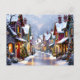 Um cartão postal bonito de Natal com ilustração de uma vila festiva e festiva nevada com telhados cobertos de neve, uma rua de pedra calcária e vibrações antiquadas. No verso, você também pode adicionar suas próprias mensagens e fotos de feriado personalizadas.