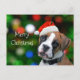 Cachorro branco e desfiladeiro veste um chapéu de Papai Noel muito pequeno e fica bonito com luzes de Natal brilhantes no cão de fundo amante cartão postal de Natal