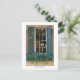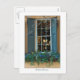 Este cartão-postal apresenta uma foto de uma típica janela Charleston, SC em médio-dezembro, uma janela em flor e uma árvore de Natal iluminada visível através do vidro.