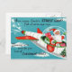 Este cartão-postal de natal "snazzy" apresenta uma ilustração antiga do Pai Natal a entregar presentes na sua nave espacial. O cartão perfeito para fãs de Papais noeis e todas as coisas retrógradas!