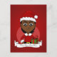 Design com uma ilustração de uma linda e sorridente menina negra feliz com cabelo curto, ela está vestindo fantasia vermelha e branca do Papai Noel e segurando um presente; com texto editável modelo para seu nome ou mensagem, design de Natal com fundo vermelho