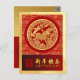 Um visual elegante de um cavalo ouro com flores em círculo (inspirado pelo tradicional corte de papel chinês) com um círculo vermelho e amarelo tradicional asiático + "FELIZ ANO NOVO" gráfico em chinês e inglês e antiga caligrafia chinesa para "cavalo" à direita sobre a banda vermelha gradiante. Na parte de trás estão o mesmo plano de fundo gradiente (à esquerda) para os textos personalizarem: sua mensagem e seu endereço de retorno + papel texturizado do ouro (imagem impressa) à direita. Design no cartão postal de feriado vertical. Você pode personalizar facilmente este cartão postal de Ano Novo Lunar personalizando a saudação no verso ou deletando para sua nota manuscrita, digite seu endereço de devolução. Cartaz de feriado de folha de alumínio real.