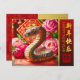Cobra chinês no estilo recortado de papel e origami rodeado por peonias flores em papel + "FELIZ ANO NOVO" gráfico em chinês e inglês e antiga caligrafia chinesa para "cobra" à direita na banda vermelha gradiante. Design no cartão postal horizontal com desejos de personalização em trás + mesma imagem com filtro vermelho para criar um plano de fundo discreto. Perfeito para o Ano Novo Chinês do Cobra 2025 ou Aniversário (nascer pessoas no Ano Cobra).