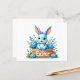 Um belo coelhinho azul alegre com um cesto de flores, uma expressão amigável, deseja-lhe Felz pascoa.