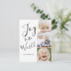 Personalize este design moderno e elegante com letras à mão com as palavras "Alegria ao Mundo" em preto e branco. Um cartão de Natal simples e moderno com foto. Elke Clarke ©
