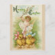 Um cartão de cumprimentos antigo brilhante bonito do desejo do felz pascoa do vintage, caracterizando uma menina alegre doce com o cabelo curto que remove os pintinhos.