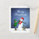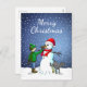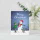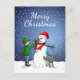 O menino construiu um boneco de neve que seu cachorro se sustenta e urina enquanto o menino dá ao boneco de neve um nariz de cenoura.