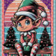 Um elfo alegre vestido com uma roupa festiva senta-se sobre uma pilha de presentes coloridos, cercado por árvores de Natal brilhantes. O fundo apresenta um pôr do sol vibrante com um design com padrão, melhorando o tema do feriado.