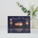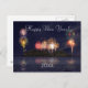 Cartaz bonito e único para celebrar um novo ano com fogos de artifício, castelo e champanhe no mar. Um feliz ano novo!