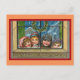 Cartão de Ano Novo Vintage com quatro crianças olhando em uma janela enquanto brincam na neve do inverno.