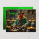 Leprocaia-branca numa caverna com ouro (ilustração por AI - modelo n°3). Design no cartão postal de feriado com citação irlandesa e saudação para personalizar no verso.