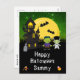 Essa carta de Dia das Bruxas divertida e assustadora pode ser personalizada com um nome ou título, como filha, neta, sobrinha, amiga etc. Ele apresenta monstros Frankenstein bonitos ao lado de uma casa assombrada. Ao fundo está uma lua de cheio com morcegos e um céu noturno verde com estrelas. O texto combina fontes decorativas e serif para um aspecto na moda e moderno. Isto é perfeito para o Halloween.