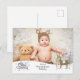 Este cartão-postal de Natal bonito apresenta uma moldura de neve na parte inferior, com a legenda "Feliz Natal" no lado esquerdo, e uma bela rena com flocos de neve no lado direito. A foto retrata um bebê adorável com um chapéu de rena e um ursinho de pelúcia ao lado dele. Facilmente personalizável substituindo a foto por uma de suas fotos favoritas!