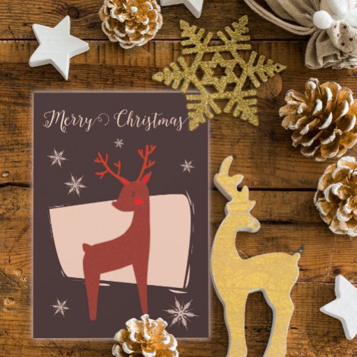 Feliz cartão de Natal com um veado bebê bonitinho sobre um fundo com flocos de neve e uma forma estilizada em cores de tons de terra quente na tendência para este Natal. Personalize com seus próprios detalhes e envie para seus entes queridos.