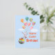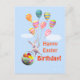 Cartão-postal com a minha trabalho de arte de um coelho fofo segurando-se num bando de balões coloridos de ovo Páscoa flutuando no céu enquanto carregando um cesto cheio de presentes de aniversário. Texto personalizável diz "Aniversário do Felz pascoa!"