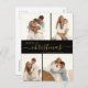 Cartão-postal de Natal Moderno, Minimalista, Elegante, "Feliz Natal", com 4 imagens de colagem de fotos, em preto e ouro. Este moderalista festivo e claro, modelo de quatro (4) fotos da família de cartões de feriado apresenta uma bonito colagem fotográfica em grade e diz "Feliz Natal"! O script de texto de saudação de "Natal" é escrito em um tipo de fonte de texto de balanço suave e suave. Na parte de trás, uma foto e sua mensagem. Bonito cartão de boas-vindas para sua família e amigos na temporada de festas de inverno.