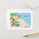 Cartão de Natal Humorístico. Cartoon de Papais noeis e suas renas em férias de praia tropical ensolaradas. A Cláusula Santa sem camisa em troncos de natação vermelhos está andando pelas ondas. Uma rena está correndo com uma prancha de surfe. Outras renas estão bronzeando ou lendo na areia. O título é "Yule Tide". Um excelente postal de feriado engraçado para mensagens pessoais ou comerciais. Visite o Doodle World de Jenn para ver mais cartões de cartoon de Natal e presentes engraçados.