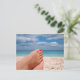 Cartão dos pés das mulheres com verniz para as unhas rosa vermelha em uma praia branca em uma ilha no mar Mediterrâneo que relaxa durante as férias de verão.