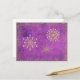 Este cartão-postal tem três flocos de neve dourados pontilhados com rochas negras nítidas sobre fundo roxo. Uma poeira de açúcar de ouro dá um quadro.