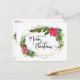 Design de Natal simples, elegante e moderno, com script de caligrafia personalizado "Feliz Natal" com campo de texto opcional editável, com poinsetos de aquarelas, holly e pine em uma estrutura fina assimétrica de ouro com bainha fina. A parte traseira apresenta gráficos complementares e campos de texto adicionais. Todos os elementos gráficos são personalizáveis.
