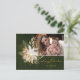 Elegante poinsettia branca artística, folhas verdes, pinheiro de inverno, verde-ouro e faíscas com caligrafia personalizada "Feliz Natal" e borda falsa de ouro para sua foto de feriado no fundo verde de caçador artístico. Inclui campos de texto editáveis.