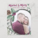Celebre seu primeiro Natal casado com este cartão com fotos de feriado no estilo água rústico, com texto "Casado e Feliz" na letra da caligrafia de ameixa, com uma linha de texto editável e coloque para sua foto de keepsasawn moldada por um galho de pássaros, uma coroa de pinho e uma coroa de pinho sobre o fundo da cinza com uma camada opaca opcional. Padrão colado complementar atrás.