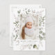 Cartaz de feriado elegante com sua foto vertical, emoldurada em branco, com fundo de groselhas de neve, holly, folhas de eucalipto, e folhagem verde de sábio. Personalize a frente do cartão postal botânico de Natal com uma saudação personalizada e o nome da sua família em caracteres verdes seniores. O cartão postal reverte para exibir seu endereço de devolução e mensagem personalizada