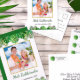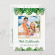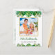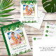 Estes divertimento, folha tropical luxúria moderna da praia das características de design do cartão do feriado na parte dianteira, incluindo as frondas da palma e as folhas do philodendron do monstera, decoradas com luzes coloridos de incandescência, na parte superior e na parte inferior. No meio é uma foto quadrada ouro-afiada customizável que você possa substituir com seus próprias. Abaixo da foto são duas linhas customizáveis do texto, incluindo o cumprimento "Mele Kalikimaka," a maneira havaiana de dizer o Feliz Natal. Você pode personalizar este design com seu próprio cumprimento, nome e ano, ou o outro texto de sua escolha. A parte traseira do cartão inclui um nome e endereço, uma mensagem, e uma assinatura do retorno customizáveis no texto verde e preto, junto com uma folha subtil overlay que combine a parte dianteira do cartão.