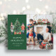 Cartão postal de férias com foto moderna verde de Natal. Este cartão postal de foto de Feliz Natal original e fofo apresenta soldados de brinquedo nutcracker pintados à mão ao redor de uma bela árvore e texto para adicionar o nome da sua família e ano. O verso inclui um texto para personalizar. Encontre itens correspondentes na Coleção de Natal do Nutcracker de Natal.