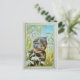 Um cartão de Natal da era vitoriana que retrata um gato com um aspecto um pouco triste a olhar para as flores.