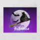 Esta design do Dia das Bruxas apresenta um gato preto com um chapéu de bruxa voando na noite em uma vassoura-de-bruxa cercada por morcegos em frente a lua de cheio e um texto dizendo "Feliz Dia das Bruxas".